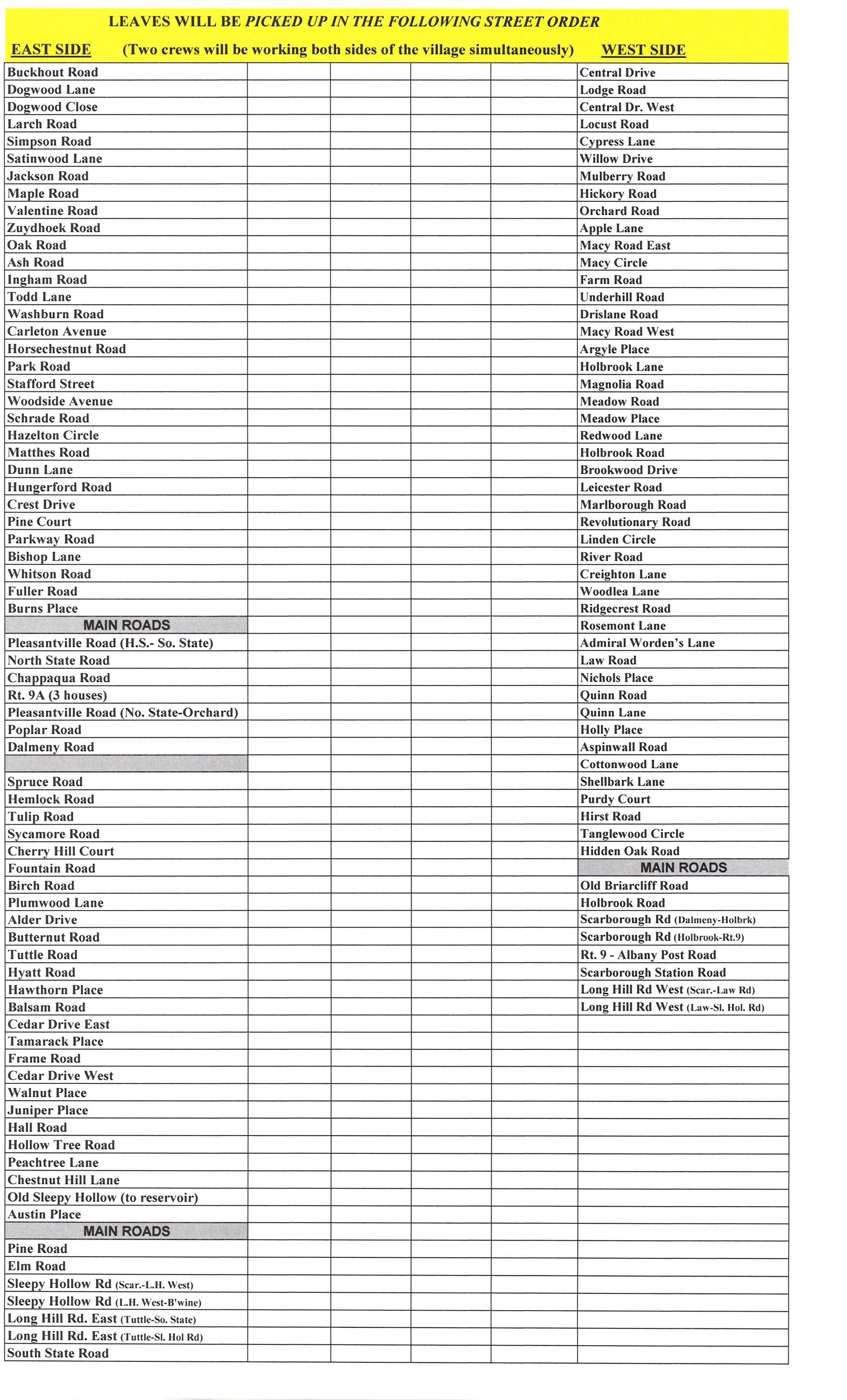 After that date, leaf pick-up will be suspended until the spring. Beginning April 1st, leaves must be placed in paper bags and will be picked up on Recycle Wednesdays. Brown leaf bags are available for purchase for $1 each at 10 Buckhout Road.